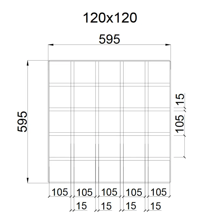 Грильято GL-15 120x120, высота 37 мм, ширина 15 мм, черный — подвесной потолок с решетчатой конструкцией, выполненный из алюминия с черным покрытием. Ячейки размером 120x120 мм и профиль высотой 37 мм придают потолку лёгкость и чёткие геометрические линии. Черный цвет придает потолку строгий и стильный вид, подходящий для современных интерьеров, особенно в минималистичном и индустриальном стилях.