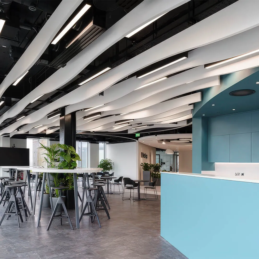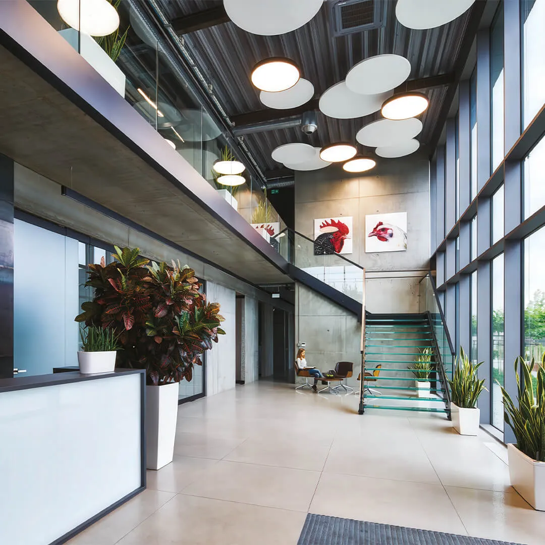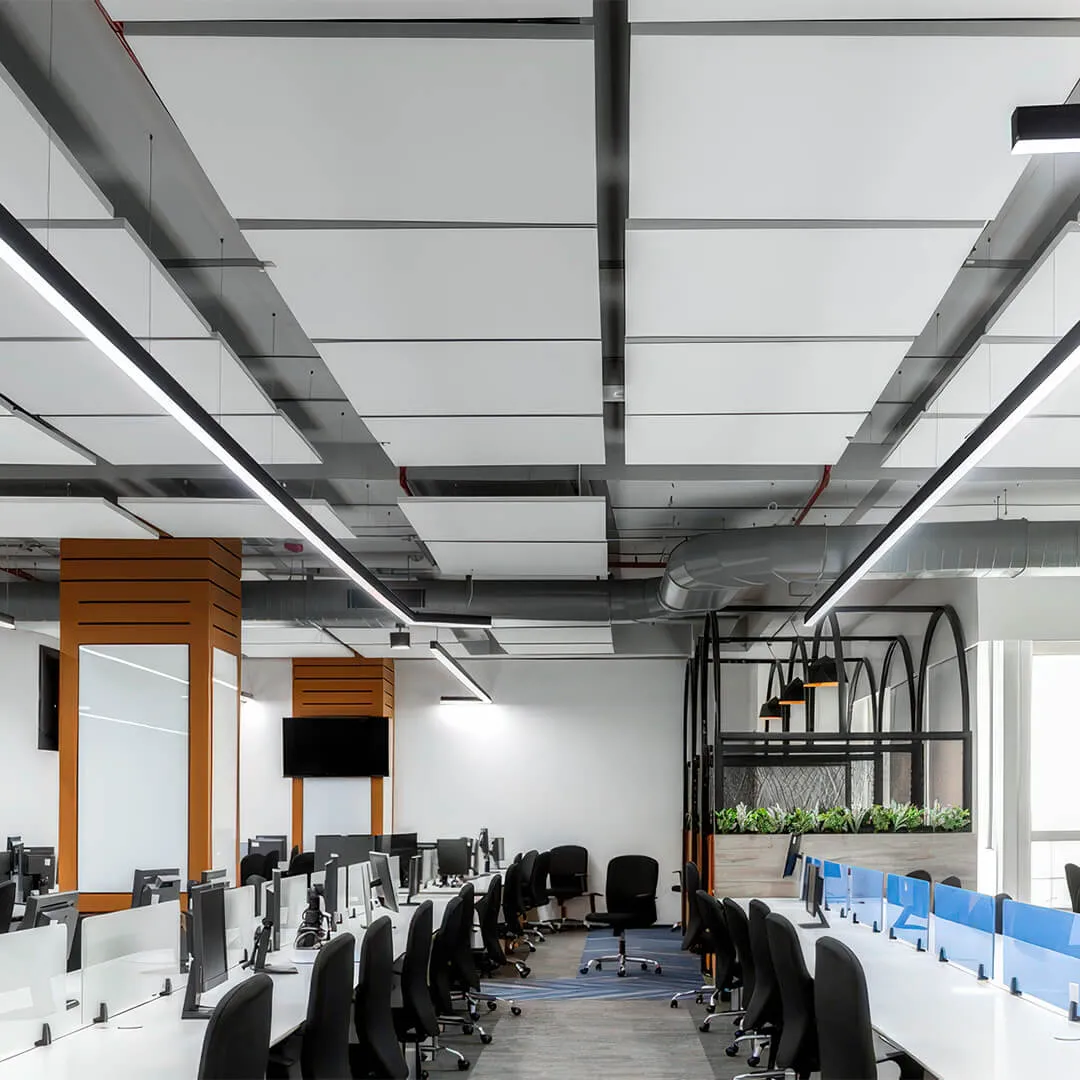 • Системы для открытых пространств: подвесные панели и облака, которые эффективно снижают шум в больших помещениях.