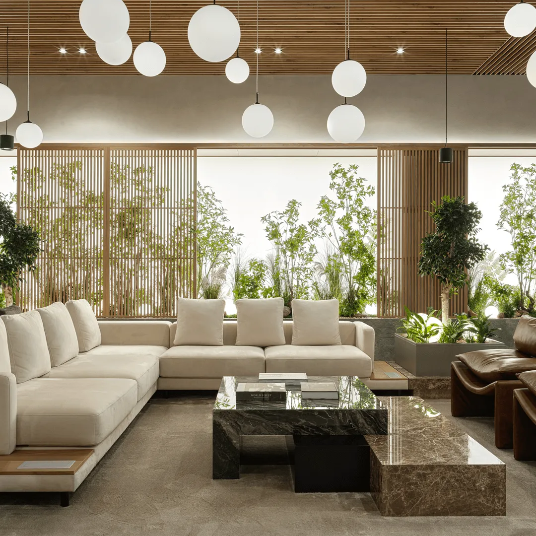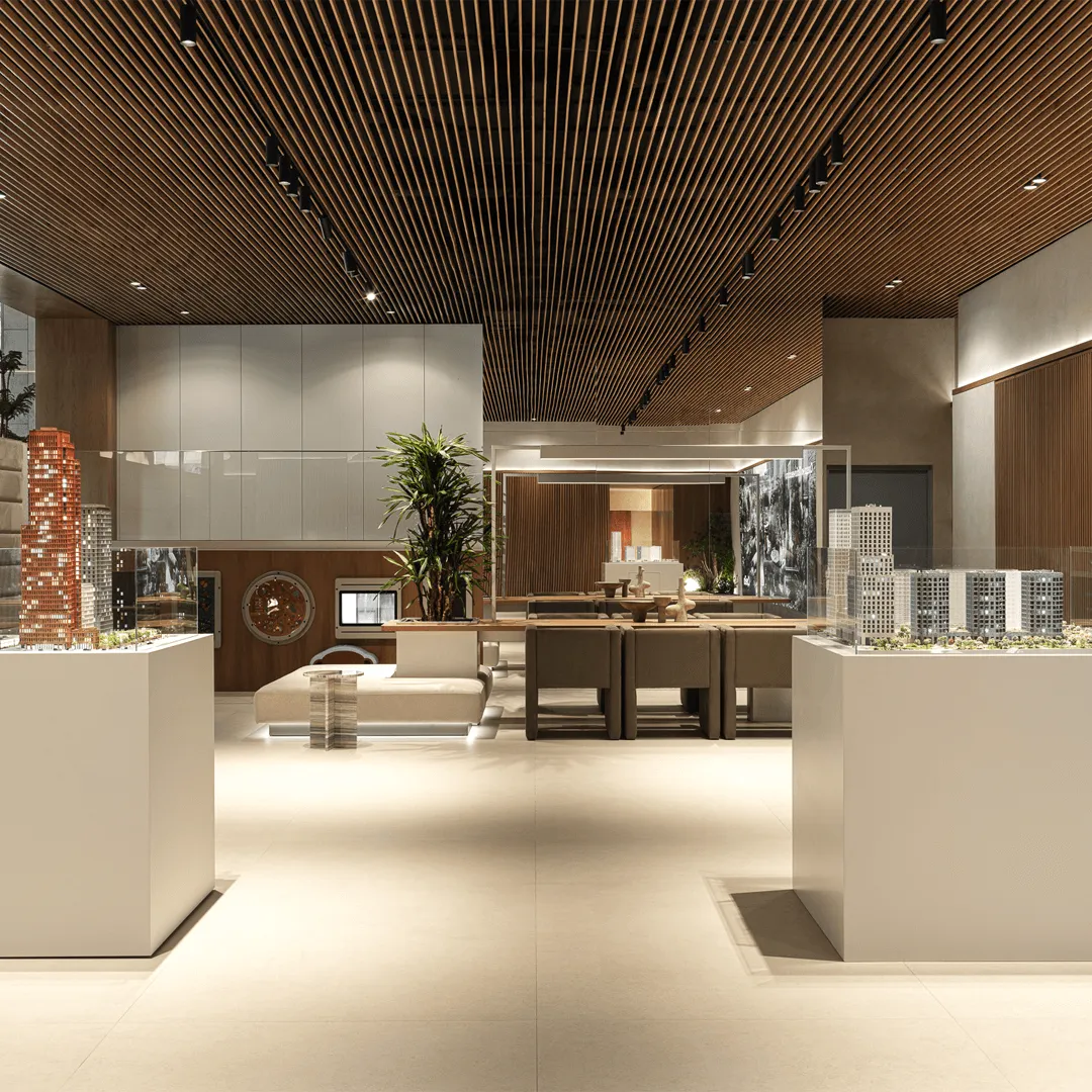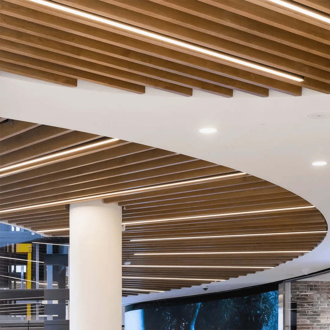- Реечные потолочные и стеновые системы: металлические ламели, доступные в различных цветах по шкале RAL, а также с текстурами ценных пород дерева. Возможен монтаж в разных плоскостях и с различным шагом, включая установку "волной".
