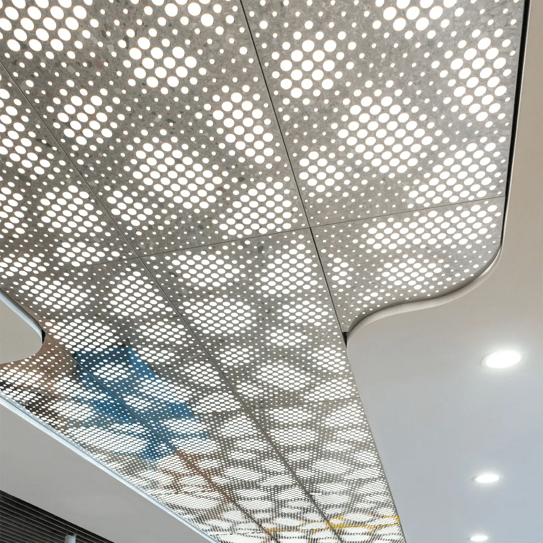 - Модульные 3D системы: металлические 3D модули для потолочных и стеновых конструкций, которые могут быть изготовлены по индивидуальным размерам и формам, с возможностью нанесения художественной перфорации.