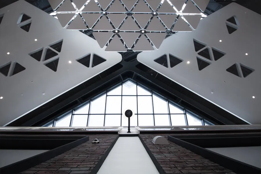 Такое архитектурное решение позволило сохранить ощущение лёгкости и открытости, а треугольные вырезы в панелях пропускают естественный свет, создавая мягкое дневное освещение и визуальный интерес.