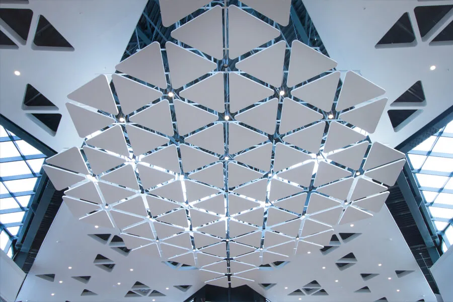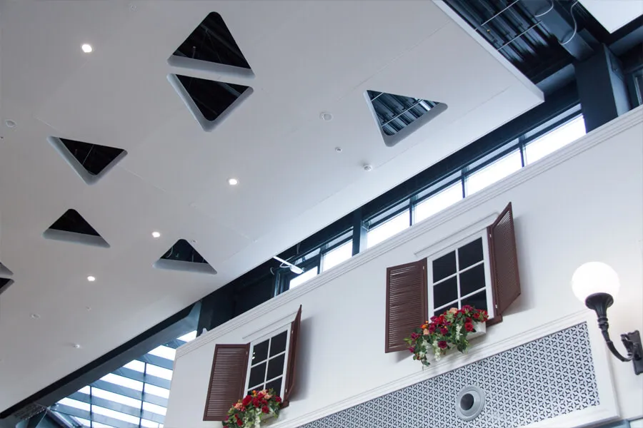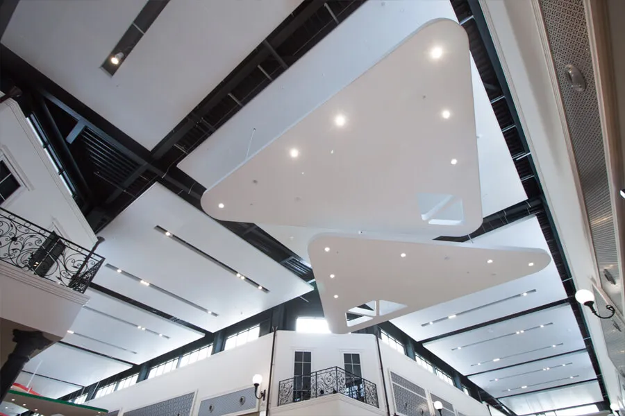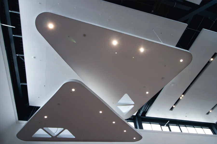 - Для обеспечения прочности конструкции использовалась подвесная система Armstrong LongSpan — специально адаптированная под большепролётные зоны.