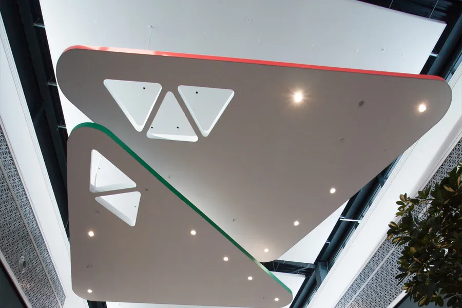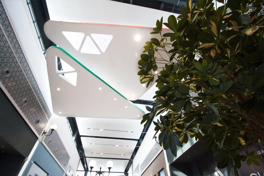 - В центральном атриуме использованы потолки-фрагменты Armstrong Optima L Canopy в форме треугольников, подвешенные на разной высоте, создающие эффект «парящих облаков».